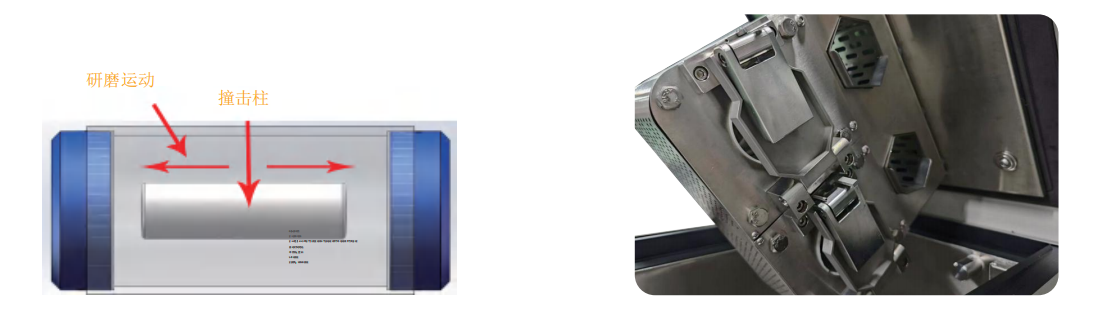 采用电磁振荡撞击来研磨粉碎样品,将样品和金属撞击柱一起装入研磨罐内,研磨罐两端用塞头密封后放入电磁振动圆桶线圈内,电磁线圈和研磨罐一同浸入液氮里进行预冷冻和撞击研磨,整个过程都处于液氮环境里(-196℃),电磁振动线圈产生的磁力驱动撞击柱做水平往返运动,从而不断地撞击样品,使已经冷冻脆化的样品被快速研磨粉碎。